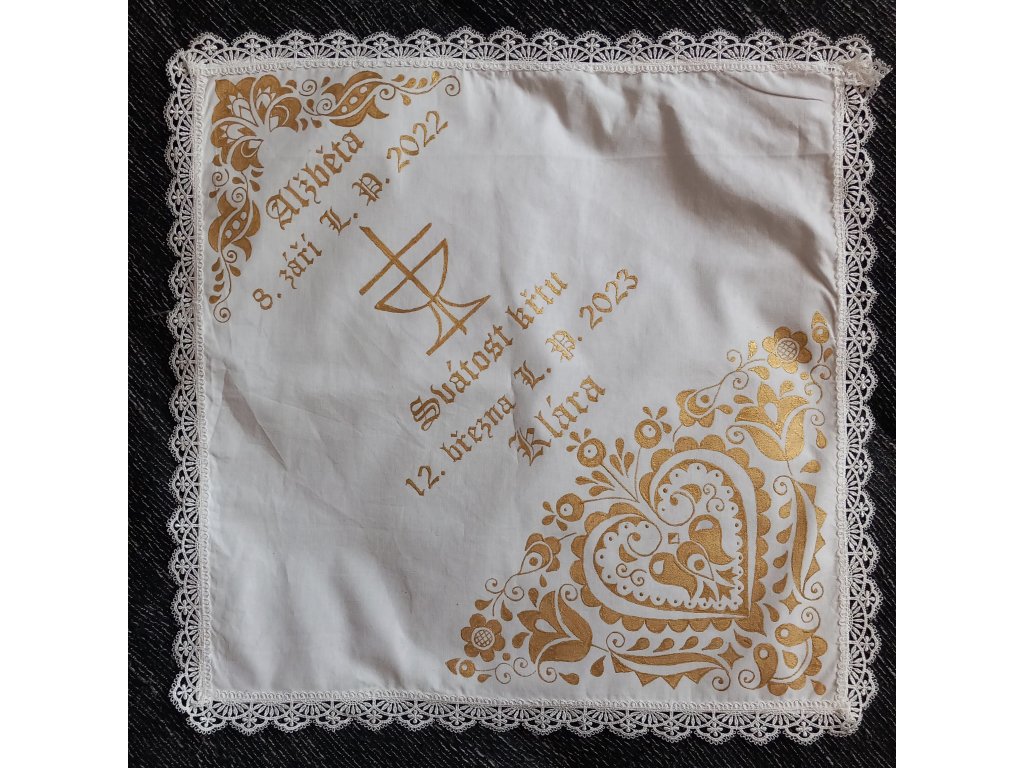 Rouška je ušitá z bavlněného plátna a krajky. Ručně malovaný ornament jí dodá na jedinečnosti. Vybrat si můžete vzor i barevnost (jednobarevná – zlatá, stříbrná, barevná, nebo dle Vaší fantazie). Roušky pro Vás šijeme vždy na míru, může mít tedy jak obdélníkový tvar (rozměry například 52×40 cm), tak čtvercový (například 42×42 cm). Uvedená cena je pouze orientační, výsledná částka závisí na náročnosti vzoru. Stejně jako další malované produkty je doba dodání trošku delší – obvykle cca 14 dní. Pokud na roušku spěcháte, napište nám, zkusíme společně něco vymyslet.